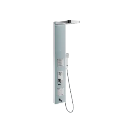 Panel Glas wykonany jest ze stali nierdzewnej z przednim panelem ze szkła, posiada górną deszczownię zintegrowaną, 3 dysze boczne oraz dodatkową wylewkę wannową. Jedno pokrętło pozwala na regulację ciśnienia i temperatury wody(głowica Sedal), a drugie pozwala na wybór odbiornika wody.