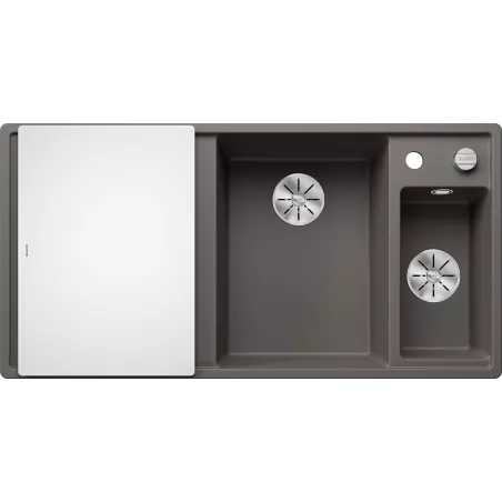 deska do krojenia z bezpiecznego szkła, wielofunkcyjna odsączarka ze stali szlachetnej, armatura przelewowo-odpływowa zapewniająca więcej miejsca w szafce, 2 x korek z sitkiem 3 ½'’ InFino ze sterowaniem korkiem automatycznym (pokrętło) do komory głównej