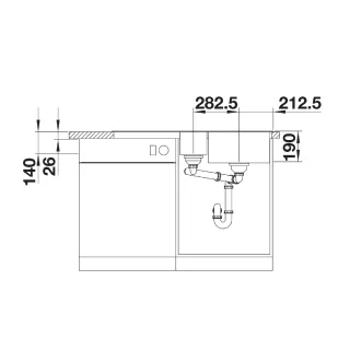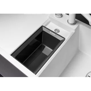 wkład z tworzywa z pokrywą w kolorze antracytowym, armatura przelewowo-odpływowa zapewniająca więcej miejsca w szafce, dwa korki z sitkiem InFino 3 ½'' i 1 ½'' ze sterowaniem korkiem automatycznym (pokrętło) do komory głównej