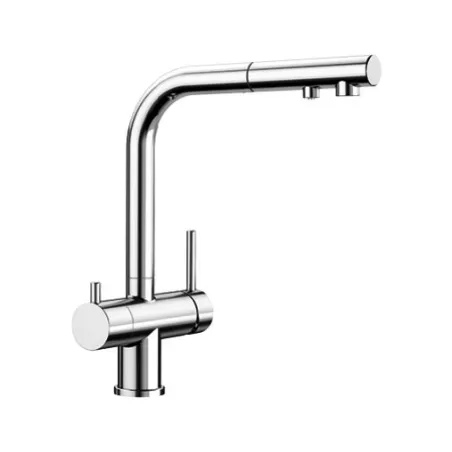 woda filtrowana i niefiltrowana z jednej wylewki z osobnymi kanałami przepływu. Posiada oddzielną dźwignię z prawej strony do wody mieszanej (ciepłej i zimnej ) oraz dźwignię do wody filtrowanej z lewej strony. Wymaga tylko jednego otworu 35 mm do zamocowania baterii, dzięki czemu mamy rozbudowany system dostarczania wody i zaoszczędzamy miejsce. Wyciągana wylewka ułatwia napełnianie naczyń.