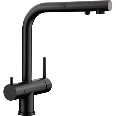 woda filtrowana i niefiltrowana z jednej wylewki z osobnymi kanałami przepływu. Posiada oddzielną dźwignię z prawej strony do wody mieszanej (ciepłej i zimnej ) oraz dźwignię do wody filtrowanej z lewej strony. Wymaga tylko jednego otworu 35 mm do zamocowania baterii, dzięki czemu mamy rozbudowany system dostarczania wody i zaoszczędzamy miejsce. Wyciągana wylewka ułatwia napełnianie naczyń.