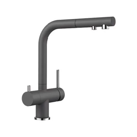 woda filtrowana i niefiltrowana z jednej wylewki z osobnymi kanałami przepływu. Posiada oddzielną dźwignię z prawej strony do wody mieszanej (ciepłej i zimnej ) oraz dźwignię do wody filtrowanej z lewej strony. Wymaga tylko jednego otworu 35 mm do zamocowania baterii, dzięki czemu mamy rozbudowany system dostarczania wody i zaoszczędzamy miejsce. Wyciągana wylewka ułatwia napełnianie naczyń.