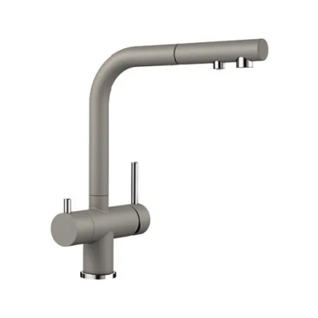 woda filtrowana i niefiltrowana z jednej wylewki z osobnymi kanałami przepływu. Posiada oddzielną dźwignię z prawej strony do wody mieszanej (ciepłej i zimnej ) oraz dźwignię do wody filtrowanej z lewej strony. Wymaga tylko jednego otworu 35 mm do zamocowania baterii, dzięki czemu mamy rozbudowany system dostarczania wody i zaoszczędzamy miejsce. Wyciągana wylewka ułatwia napełnianie naczyń.