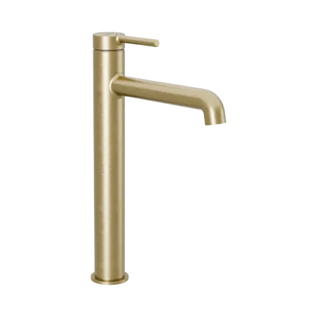 Bateria umywalkowa stojąca wysoka złoty szczotkowany została zaprojektowana z myślą o umywalkach nablatowych bez otworu na baterię. Wylewka o zasięgu 158 mm i wysokości 290 mm zapewnia wygodne korzystanie z umywalki oraz odpowiednią przestrzeń pod strumieniem wody. Smukła, podwyższona konstrukcja podkreśla nowoczesny charakter strefy umywalkowej i pozwala stworzyć spójną, elegancką kompozycję z umywalką ustawioną na blacie.
