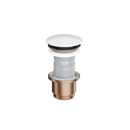 Design Korek klik-klak w wykończeniu korpus miedziany szczotkowany, pokrywa ceramiczna biała to eleganckie i nowoczesne rozwiązanie do każdej łazienki. Łączy estetykę z funkcjonalnością, zapewniając trwałość i komfort codziennego użytkowania. Doskonale komponuje się z nowoczesną ceramiką oraz armaturą.
