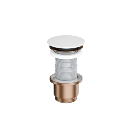 Design Korek klik-klak w wykończeniu korpus miedziany szczotkowany, pokrywa ceramiczna śnieżnobiała to eleganckie i nowoczesne rozwiązanie do każdej łazienki. Łączy estetykę z funkcjonalnością, zapewniając trwałość i komfort codziennego użytkowania. Doskonale komponuje się z nowoczesną ceramiką oraz armaturą.
