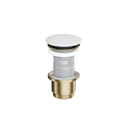 Design Korek klik-klak w wykończeniu korpus złoty szczotkowany, pokrywa ceramiczna śnieżnobiała to eleganckie i nowoczesne rozwiązanie do każdej łazienki. Łączy estetykę z funkcjonalnością, zapewniając trwałość i komfort codziennego użytkowania. Doskonale komponuje się z nowoczesną ceramiką oraz armaturą.