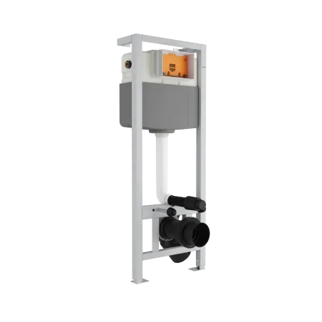 Stelaż jest prosty w montażu, posiada 4 punkty mocowania. Dzięki odpowiedniemu zaprojektowaniu zbiornika, możliwe jest podłączenie wody w dwóch miejscach z lewej strony oraz z góry. Do przyłączenia wody zastosowano wytrzymałe mosiężne przyłącze. Zestaw posiada także mosiężny zawór odcinający. Zbiornik wyposażony jest w cichy zawór napełniający z tłumikiem o I klasie głośności.