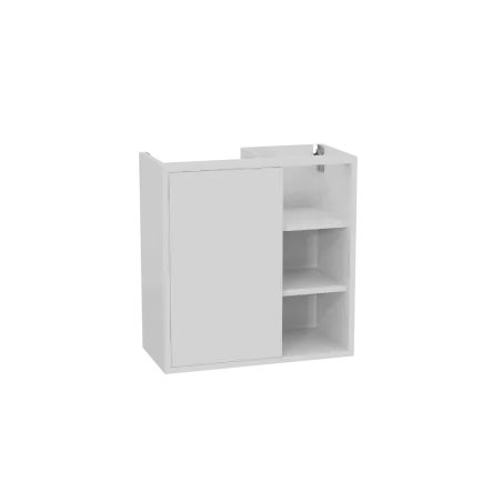 Funkcjonalna konstrukcja łączy wygodę z estetyką. Zamykana część z drzwiczkami wyposażonymi w system cichego domyku dyskretnie maskuje instalacje wodno-kanalizacyjne, oferując jednocześnie dodatkowe miejsce do przechowywania. Otwarte półki zapewniają łatwy dostęp do najpotrzebniejszych akcesoriów lub mogą pełnić funkcję dekoracyjną.