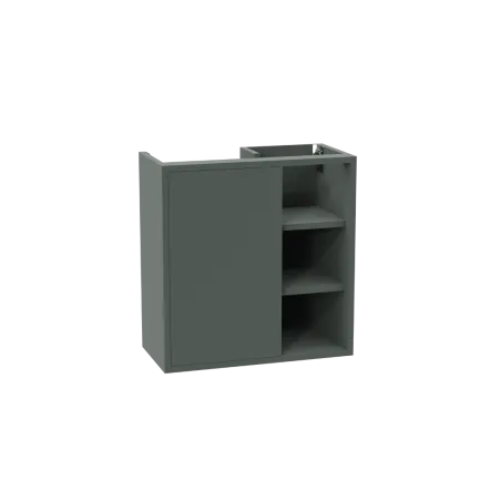 Funkcjonalna konstrukcja łączy wygodę z estetyką. Zamykana część z drzwiczkami wyposażonymi w system cichego domyku dyskretnie maskuje instalacje wodno-kanalizacyjne, oferując jednocześnie dodatkowe miejsce do przechowywania. Otwarte półki zapewniają łatwy dostęp do najpotrzebniejszych akcesoriów lub mogą pełnić funkcję dekoracyjną.