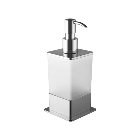 Dozownik do mydła w płynie stojący RIKO składa się z metalowej podstawki oraz pojemnika wykonanego ze szkla mrożonego wyposażonego w pompkę umożliwiającą dozowanie mydła w płynie. Metalowa podstawka wyposażona jest w plastikową obręcz zabezpieczającą szklany element przed uszkodzeniem. Podstawka posiada specjalne naklejki chroniąca powierzchnię przed zarysowaniem.
