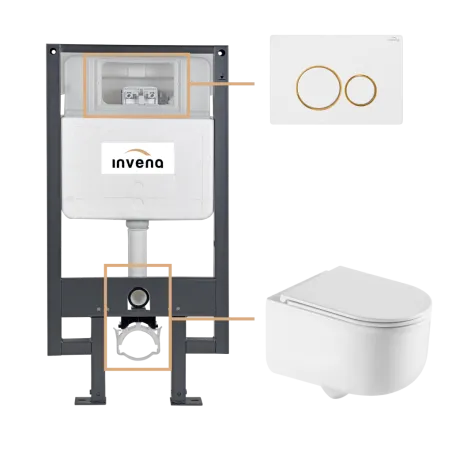 Zestaw podtynkowy WC składający się z:CE-99-001-S STELAŻ PODTYNKOWY DO MISEK WISZĄCYCH WC;CE-91-001-W MISKA WC PODWIESZANA, BEZKOŁNIERZOWA TINOS, OKRĄGŁA, Z DESKĄ WOLNOOPADAJĄCĄ;CC-03-001-S PRZYCISK SPŁUKUJĄCY DO STELAŻA PODTYNKOWEGO, 603...