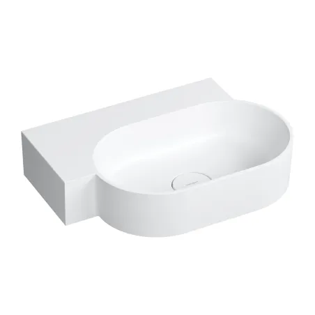 Umywalka z kolekcji OMNIRES OVO charakteryzuje się minimalistyczną, wyrazistą formą o doskonałych proporcjach. Powstały z zabawy geometrią kształt tworzą dwa przeciwległe półokręgi umywalki, połączone z prostokątną, funkcjonalną półką – idealnym miejscem do montażu baterii, a także do odstawienia kosmetyków czy innych niezbędnych akcesoriów. Harmonijnie wyprofilowane ścianki zostały wykończone płaskim, podkreślającym formę rantem, a idealnie dopasowana maskownica odpływu gwarantuje najwyższą estetykę. Od spodu umywalki zaprojektowano dyskretny, fabrycznie podcieniony punkt, który wskazuje miejsce na wykonanie otworu pod baterię.