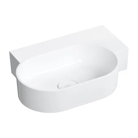 Umywalka z kolekcji OMNIRES OVO charakteryzuje się minimalistyczną, wyrazistą formą o doskonałych proporcjach. Powstały z zabawy geometrią kształt tworzą dwa przeciwległe półokręgi umywalki, połączone z prostokątną, funkcjonalną półką – idealnym miejscem do montażu baterii, a także do odstawienia kosmetyków czy innych niezbędnych akcesoriów. Harmonijnie wyprofilowane ścianki zostały wykończone płaskim, podkreślającym formę rantem, a idealnie dopasowana maskownica odpływu gwarantuje najwyższą estetykę. Od spodu umywalki zaprojektowano dyskretny, fabrycznie podcieniony punkt, który wskazuje miejsce na wykonanie otworu pod baterię.