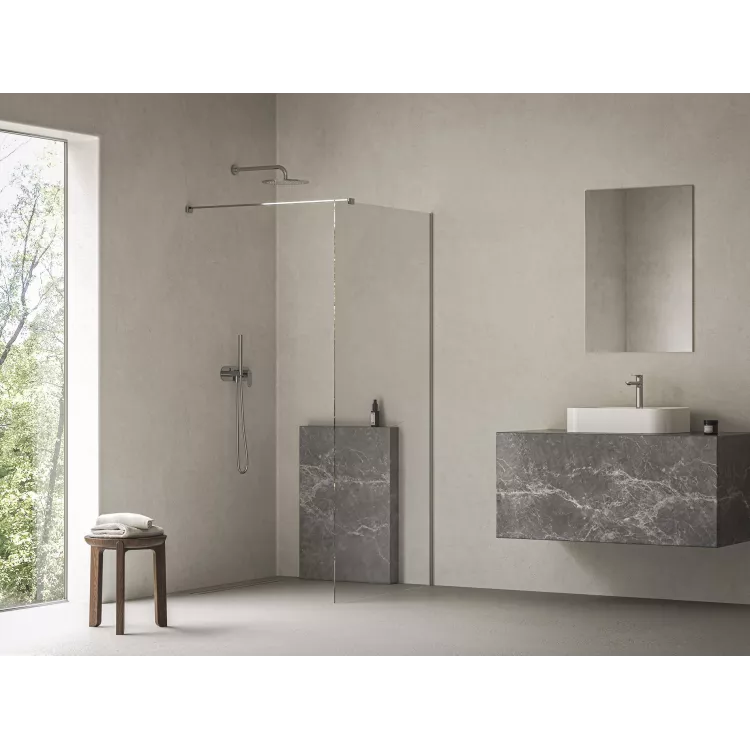 Kabina prysznicowa Walk-In Air Wall z błyszczącym chromowym wykończeniem metalowych części. Zalecamy instalację w wyłożonym płytkamii rogu łazienki bezpośrednio na podłodze z wbudowanym odpływem liniowym lub kratką odpływową. Kabina prysznicowa jest uniwersalna, przy montażu można wybrać prawą lub lewą orientację wejścia.
