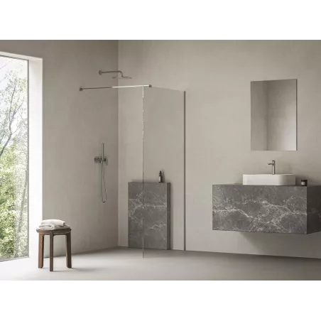 Ścianka prysznicowa Walk-In Air Wall składa się z hartowanego szkła o grubości 6 mm. Stabilność produktu zapewnia metalowy wspornik o długości 120 cm, który można dowolnie skrócić według pożądanej szerokości wejścia.