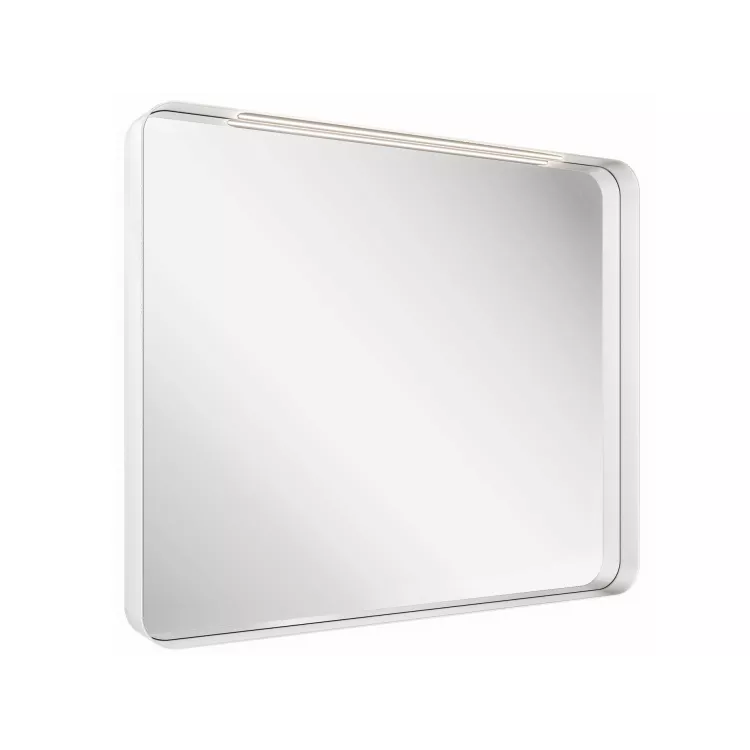 Prostokątne lustro z cienką ramą w białym wykonaniu. Wyposażone w oświetlenie LED.