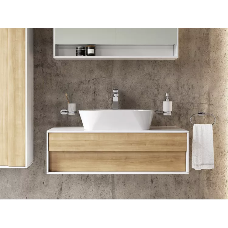Szafka z blatem pod umywalkę oferuje przestrzeń nie tylko wokół umywalki, ale także pod nią. Szuflada przechowa wszystko, co nie powinno być na widoku. Dodatkową przestrzeń do przechowywania oferuje wysoka szafka i szafka lustrzana z oświetleniem LED.