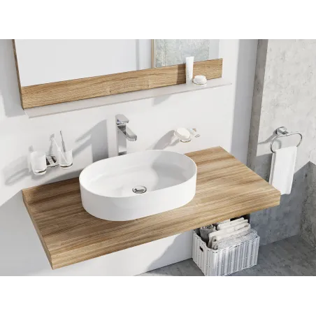 Te umywalki są przeznaczone do umieszczenia na blacie. Minimalistyczny design pięknie prezentuje się na drewnianym blacie i zapewnia wystarczająco dużo miejsca do przechowywania. Idealne są blaty z oferty RAVAK, które mają specjalne wykończenie dla długiej żywotności.