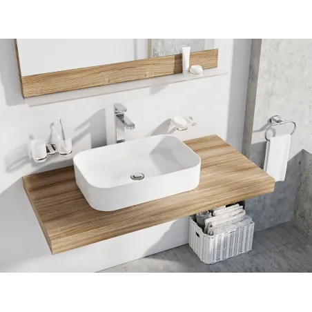 Te umywalki są przeznaczone do umieszczenia na blacie. Minimalistyczny design pięknie prezentuje się na drewnianym blacie i zapewnia wystarczająco dużo miejsca do przechowywania. Idealne są blaty z oferty RAVAK, które mają specjalne wykończenie dla długiej żywotności.