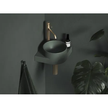 Narożna umywalka ceramiczna cienkościenna Yard przeznaczona do montażu na konsoli Yard lub na blacie, bez przelewu. Kolor Grey Green. Z otworem na baterię.