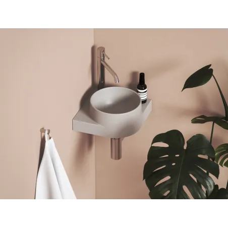 Narożna umywalka ceramiczna cienkościenna Yard przeznaczona do montażu na konsoli Yard lub na blacie, bez przelewu. Kolor Smoke Grey. Z otworem na baterię.